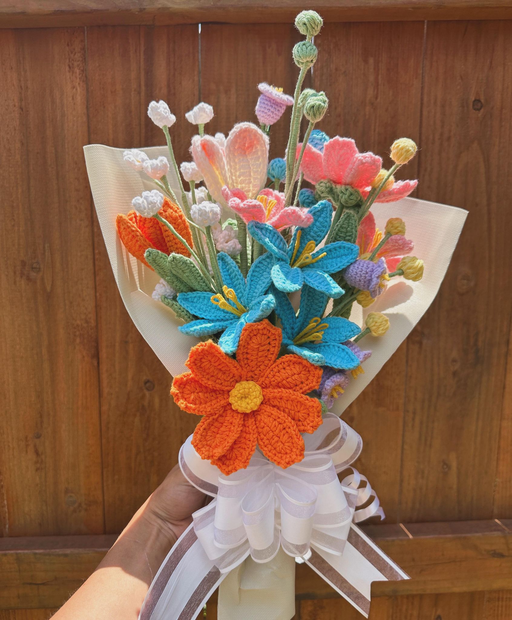 Introducing our Blossom Symphony Bouquet, a vibrant handcrafted crochet arrangement that celebrates the lively spirit of spring. This stunning bouquet features an exquisite mix of colorful blooms, capturing the essence of the season's most beautiful flowers. Each flower is meticulously crafted by hand, blending a harmonious palette of vibrant hues and intricate details. Wrapped elegantly, this bouquet brings an explosion of color and joy, making it the perfect gift for any occasion or a delightful addition to any space. Embrace the enchanting beauty of spring with this captivating Blossom Symphony Bouquet.